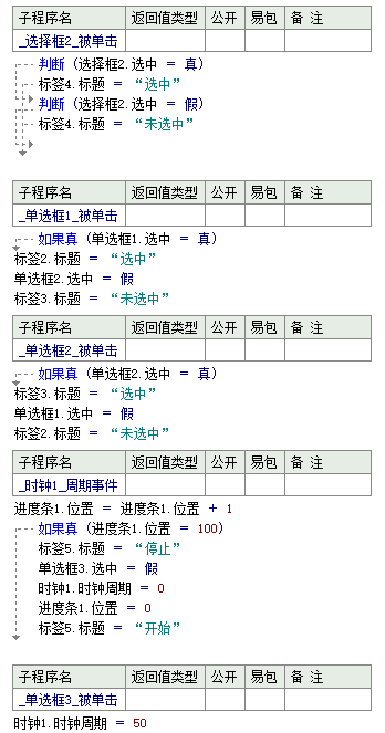 .子程序 _选择框1_被单击 .判断开始 (选择框1.选中 = 真) 标签1.标题 = “选中” .判断 (选择框1.选中 = 假) 标签1.标题 = “未选中” .默认 .判断结束 .子程序 _选择框2_被单击 .判断开始 (选择框2.选中 = 真) 标签4.标题 = “选中” .判断 (选择框2.选中 = 假) 标签4.标题 = “未选中” .默认 .判断结束 .子程序 _单选框1_被单击 .如果真 (单选框1.选中 = 真) .如果真结束 标签2.标题 = “选中” 单选框2.选中 = 假 标签3.标题 = “未选中” .子程序 _单选框2_被单击 .如果真 (单选框2.选中 = 真) .如果真结束 标签3.标题 = “选中” 单选框1.选中 = 假 标签2.标题 = “未选中” .子程序 _时钟1_周期事件 进度条1.位置 = 进度条1.位置 + 1 .如果真 (进度条1.位置 = 100) 标签5.标题 = “停止” 单选框3.选中 = 假 时钟1.时钟周期 = 0 进度条1.位置 = 0 标签5.标题 = “开始” .如果真结束 .子程序 _单选框3_被单击 时钟1.时钟周期 = 50