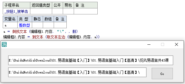 .版本 2 .程序集 窗口程序集_启动窗口 .子程序 _按钮1_被单击 .局部变量 a, 整数型 a = 倒找文本 (编辑框1.内容, “\”, , 假) 编辑框2.内容 = 到文本 (取文本左边 (编辑框1.内容, a))