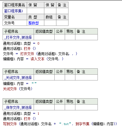.版本 2 .程序集 窗口程序集1 .程序集变量 文件号, 整数型 .子程序 _打开文件_被选择 通用对话框1.类型 = 0 通用对话框1.打开 () 文件号 = 打开文件 (通用对话框1.文件名, , ) 编辑框1.内容 = 读入文本 (文件号, ) .子程序 _关闭文件_被选择 编辑框1.内容 = “” 关闭文件 (文件号) .子程序 _保存文件_被选择 通用对话框1.类型 = 1 通用对话框1.打开 () 写到文件 (通用对话框1.文件名 + “.txt”, 到字节集 (编辑框1.内容))