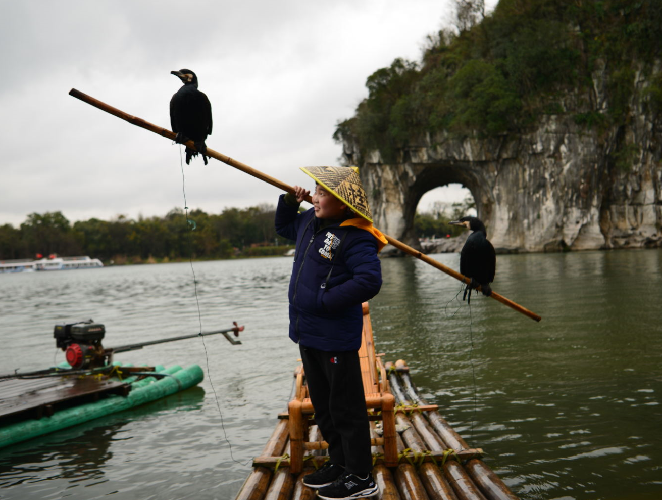 第2天也就是昨天昨天的下午,我们去了漓江坐了竹筏,我原本以为这会像武夷山一样是人工划的竹筏,到了这边才发现原来是电动的竹排。估计下面也是水泥之类的建材做的。上面有立体的竹子图案,再在上面铺了一层木板而已。都说来桂林要游漓江看一下桂林山水甲天下,所以这个竹筏还是有必要体验一下的。不过我在这个竹筏上被冻得瑟瑟发抖,两岸的风光也不是很秀丽。我用手机拍了几张照片之后便作罢了,安静的欣赏起两岸的风景来。