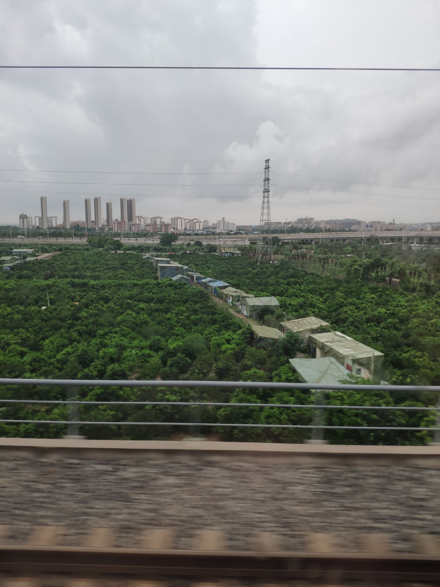 窗外天气时阴时雨,但满眼总是郁郁葱葱,空旷处能看到远方不高的群山,雾气缭绕。