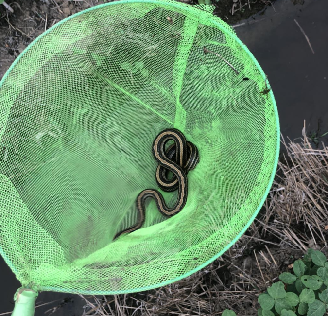 我和家玲拿了张杰前两天购买的小网子,到田里转悠。小鱼小蟹没有看,在小水渠中倒看到一条蛇。我把这条蛇捞起来转悠了几圈,到河边又把它放走了。