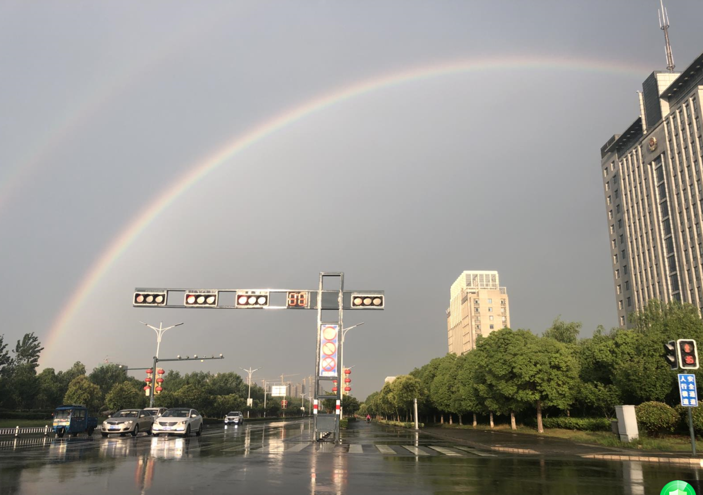 到了家中,我洗了一把澡,换好了干净的衣服。等到临近6点的时候我又去挨着接张杰和张妮妹妹放学。此时暴雨已经停止了,远处乌云散去太阳也照射了下来。远眺东边,竟有彩虹,这是多年难得一件的景象,我赶紧拍照留念。