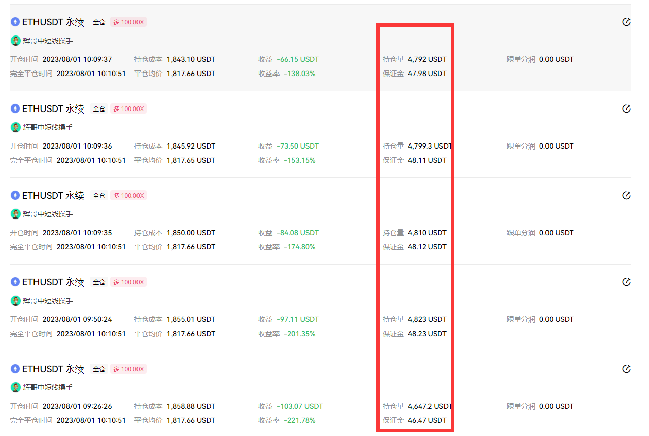 我突然意识到这些人合约倍数太高,虽然只下了60u,但连续追加几次后,合约设置了100x,导致直接亏损300%。