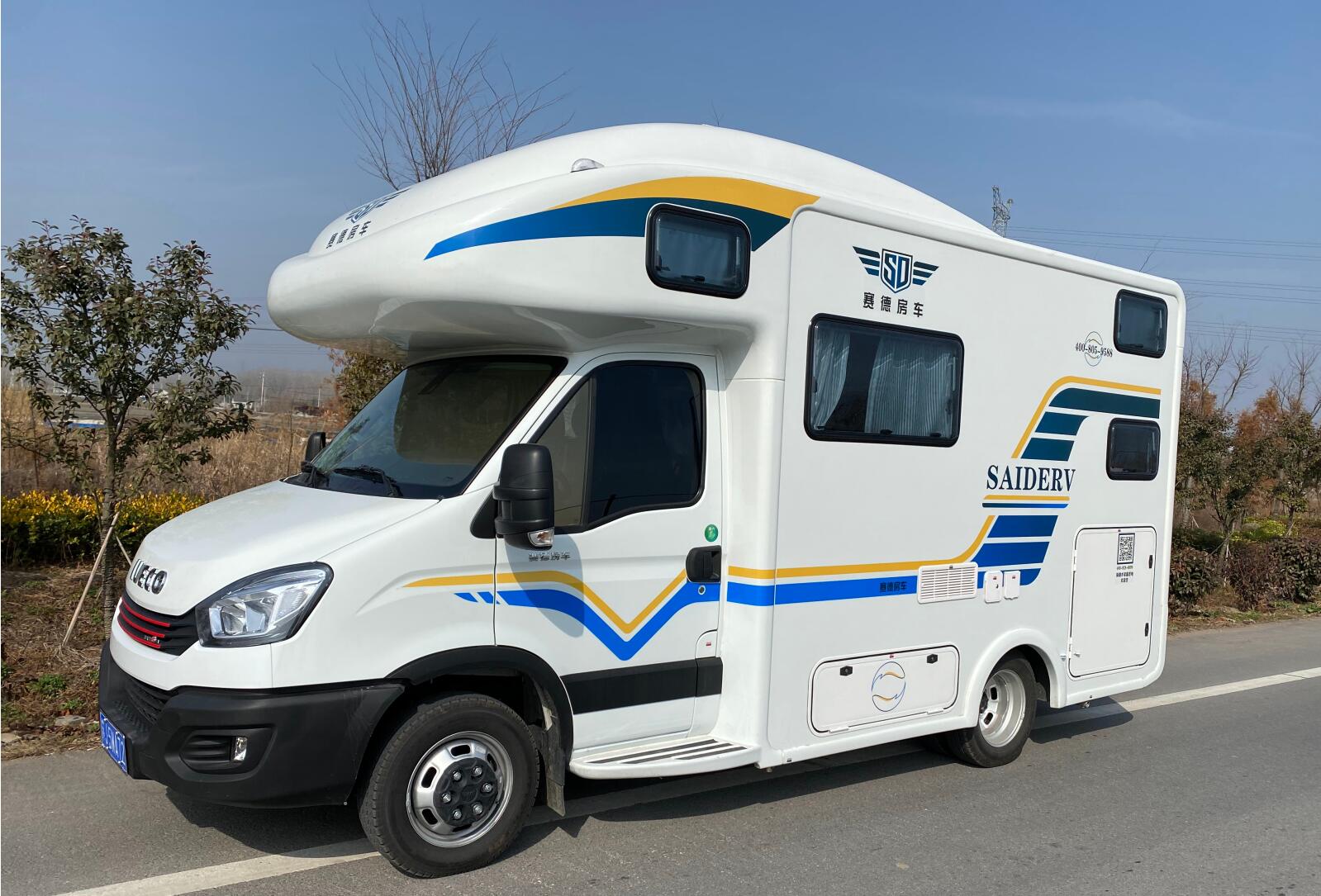 关于房车的外观,这个全车是玻璃钢的。如果说我未来还考虑买房车的话,肯定不能买玻璃钢的了。车提了更不能买车体外面有贴纸的,贴纸没几年就发黄变色了,车的玻璃钢也变色了,白一块黄一块的,真的很恶心。大家都说这个车买回来才三年多,就变得像个10年的老车一样。我的奔驰和房车停在一起,反而显得奔驰还要新一些,房车就旧得一塌糊涂了。