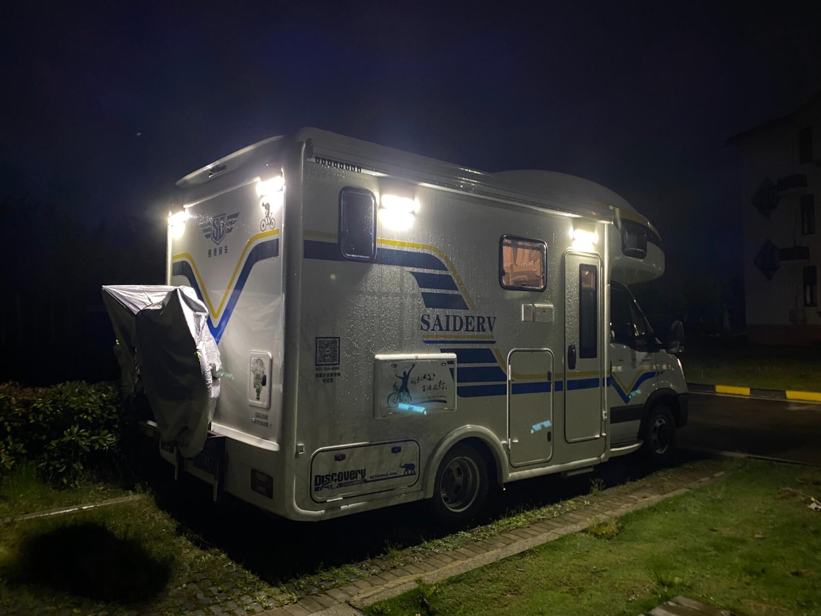 我在房车的四周装了太阳能灯。印象中,在江西的一个服务区,那天下着小雨,我把房车的灯都打开了。那天,我看着细雨中的房车灯火通明,心情真的非常美丽。其实,每一次驻车在服务区中,看着别人蜷缩在车里没有办法好好睡觉,而我住在房车里,直接躺在自己的大床上,盖着自己厚厚的棉被,真的非常舒服。实际上,这种体验真的是为数不多的,但这种感觉真的很美妙。我真的很喜欢在冬天(春秋天也行),最好能下着雨(雨越大越好),如果说下着雪那就更完美了。可惜至今一次都没有遇到过。在这种情况下,我在自己的房车里煮一点东西吃,哪怕是烧一壶热水又或者是泡一盒泡面也好,真的特别温馨。我待在房车里,盖着厚厚的棉被去睡觉,这种感觉真的是太美妙了。唉,我真的很享受一个人独处的时光。很可惜,现在有了家庭,小孩也越来越多了,所以真的没有机会……唉,我想未来很长一段时间都没有机会能体验到这样的感受了吧。