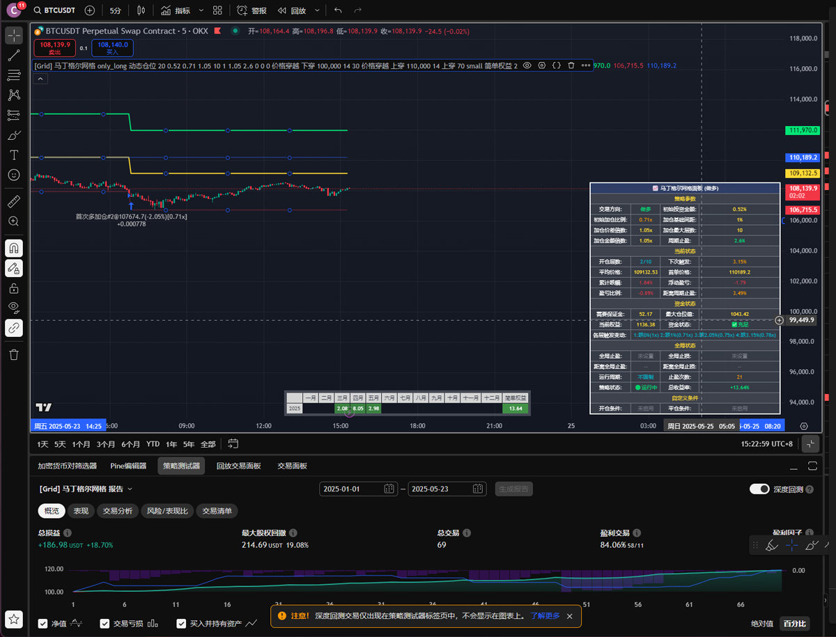 对比无脑直接在OKX开网格策略,这样做多了回测数据作为开仓的底气。当然,经过严谨回测后我也发现:**高位不能开普通的中性网格**,因为网格买入时的价格成为了网格的中轴,一旦在高位接多,亏损几乎是板上钉钉的。