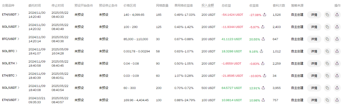 回顾一下,从2024年10月21日开始搞实盘,到现在快半年了,一直在做BTC现货网格。总共投入了1600U,最后收益才27U,仅为1.74%,还不如直接买个USDT理财。虽然BTC是涨的,但在高位开网格的结果就是盈利有限、亏损巨大。