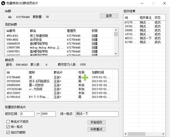 同步QQ群成员名片批量修改软件是一款用于QQ群的辅助软件,登录QQ修改QQ群成员的群名片!支持多账号多线程修改!