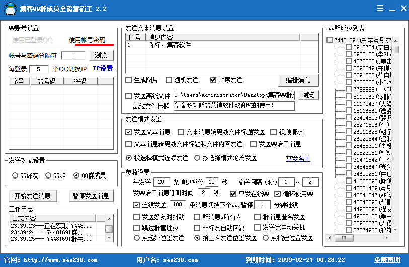 4、支持多QQ切换,批量导入QQ挂机发,可以设置一个QQ只要几十个成员换号,每轮都可以接上次位置继续发,不重复发。