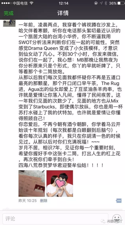 其中,18条是说恭喜Sandy小姐喜结良缘的;25条是说恭喜我喜结良缘的;30条是说我对前女友心酸祝福的;其中1条我最不能忍,这么回复的:恭喜你呀,你们好有夫妻相,大哥评论的时候麻烦点开照片看一眼好吗?