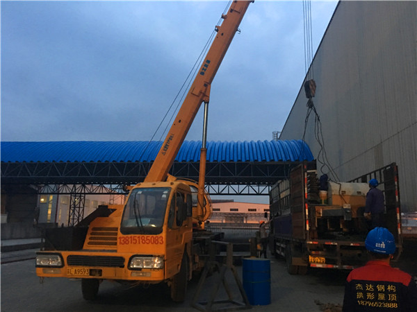 2017年4月26日继续焊接托板,中午吊车将压瓦机放置归位,江西工地人员撤场地;