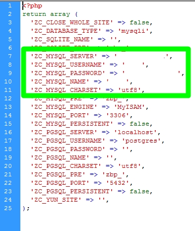 'ZC_MYSQL_SERVER' => '修改为数据库地址', 'ZC_MYSQL_USERNAME' => '修改为数据库账号', 'ZC_MYSQL_PASSWORD' => '修改为数据库密码', 'ZC_MYSQL_NAME' => '修改为数据库名称',