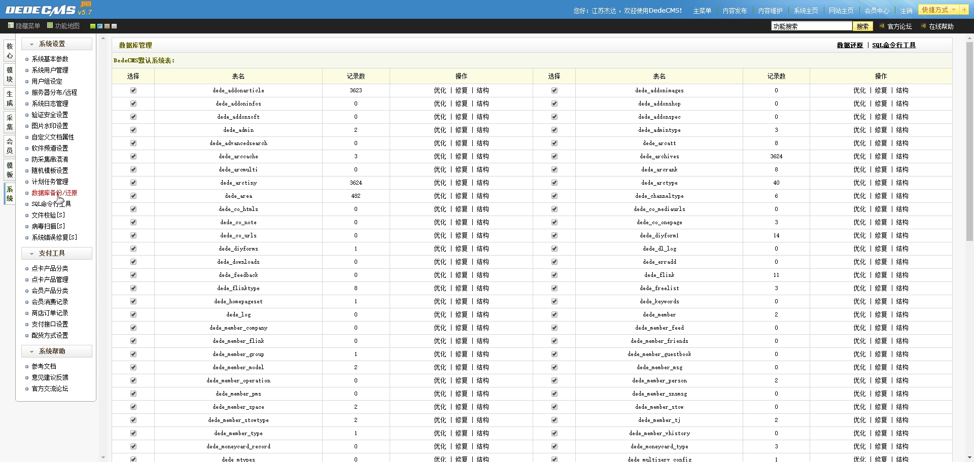 首先大家进入DEDE后台,选择系统-数据库备份-全选-然后点开始,这里要看下你的数据库对应版本要和新空间的数据库版本一样才可以,不然会出现乱码。