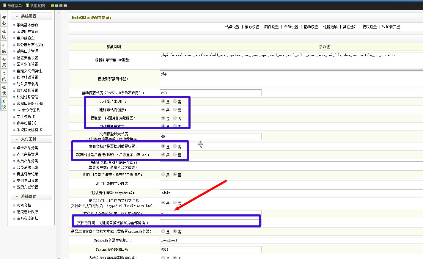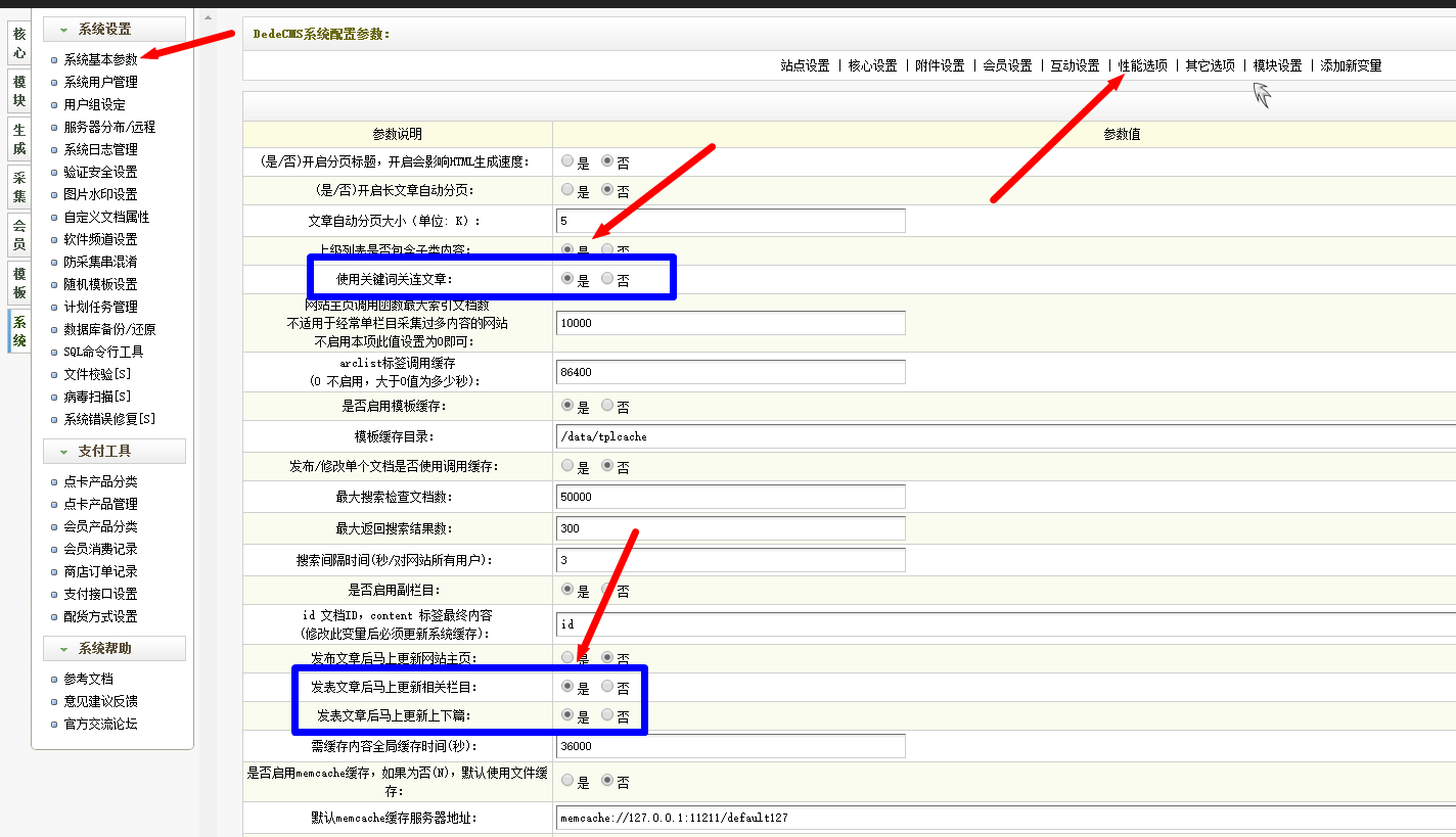 1.系统--系统基本参数--性能设置--使用关键词关联文章