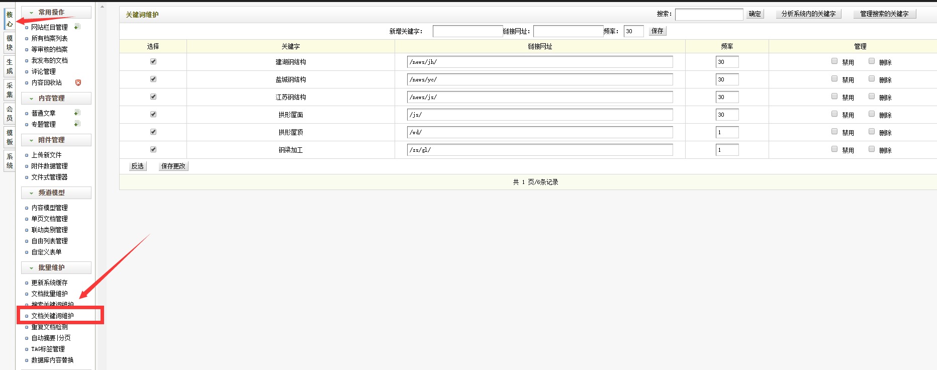 4.系统--批量维护--文档关键词维护:添加你需要的关键词及链接即可