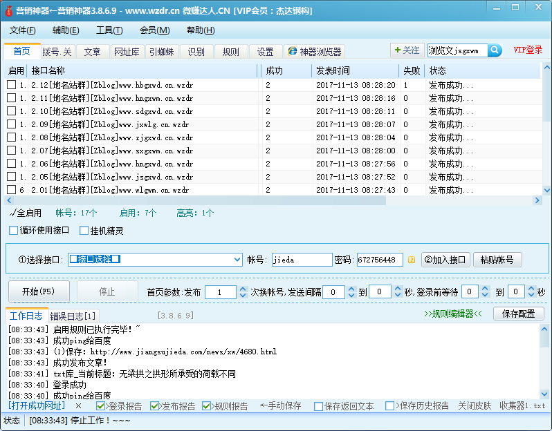 下午用营销神器分别做了我的企业站群的自动更新工具,经过测试发现其中dedecms规则第一次登录成功发布失败,第二次可以发布成功;emlogcms提取不到成功网址;