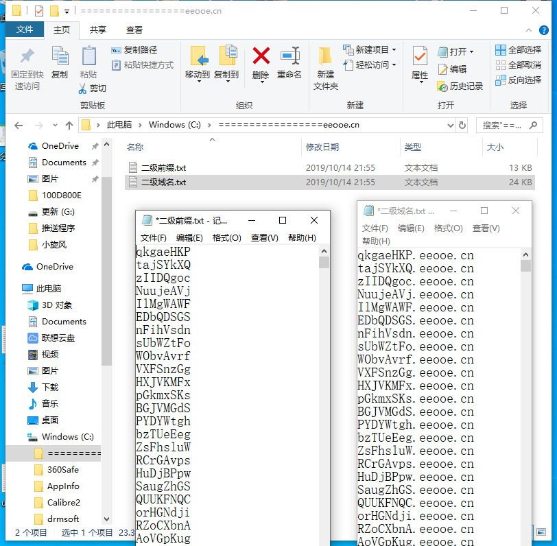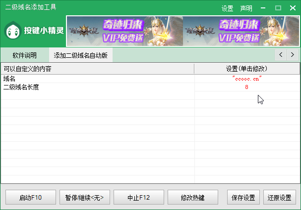 2.自动生成二级域名前缀,前缀长度可自定义设置,每次生产10个二级域名,保存到本地的文件为:二级域名前缀.txt和二级域名前缀+域名.txt;