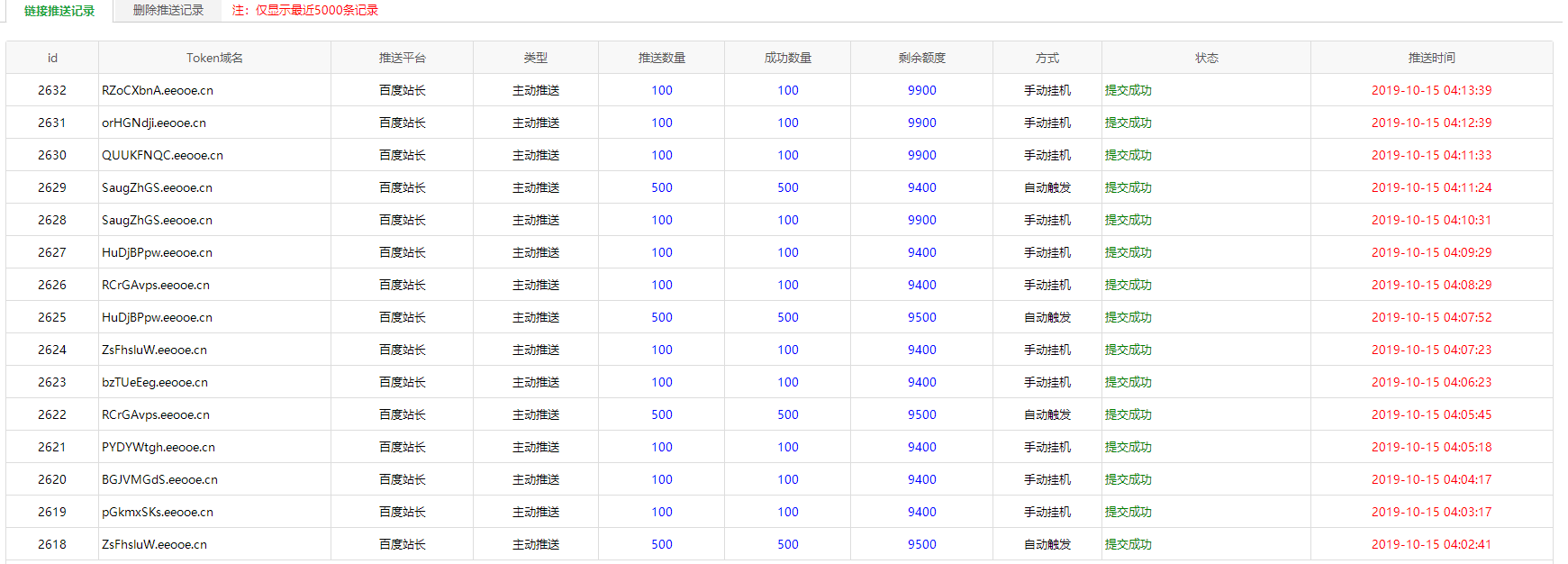 2.下图是百度后台添加成功记录,显示已经添加了1000条二级域名子站点了,添加满了;