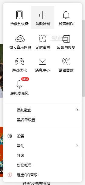 7.启动QQ音乐客户端,选择程序右上角的主菜单,在弹出的子菜单中选择“音频转码”。