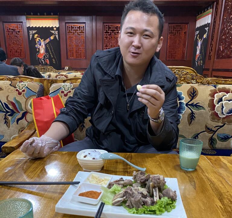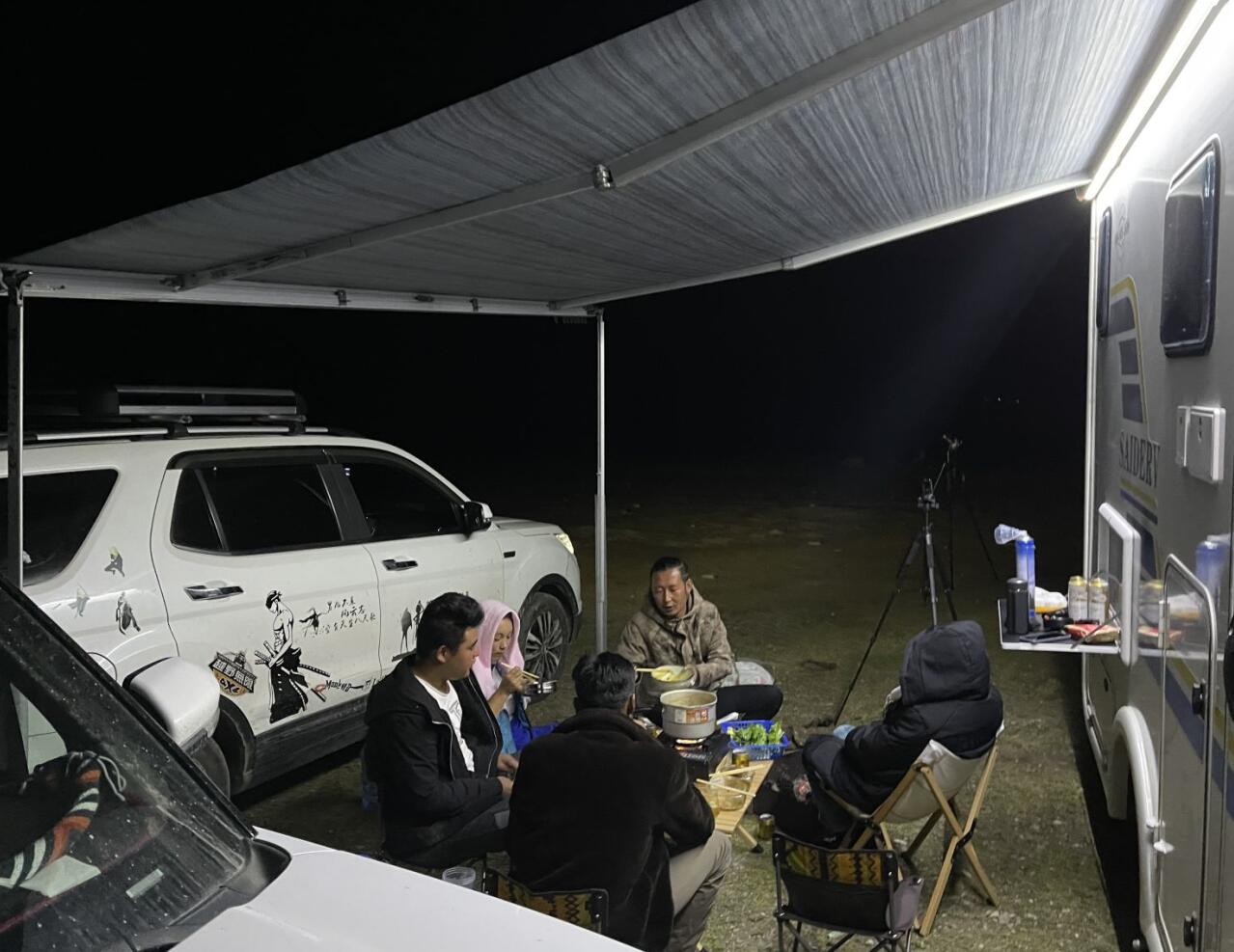 下午没事,我整出了自己的茶具和一些茶叶,和这位帮助我买票的朋友饮茶、交流。可惜我的老婆高反的厉害,我让她喝了葡萄糖,她就躺下睡了整整一个下午。我还去买了氧气瓶给她补给。经过一番交谈,我知道他的名字叫做边中卫,他原本在拉萨做完了民宿,后来因为疫情原因倒闭了,现在整的像四处流浪一样,找到他的好朋友次仁,在人家院子的空地搭帐篷。一番激情的聊天之下,我们决定一起吃晚饭。我和他还上街买了菜,晚上我们一起搞了火锅来吃。这里要详细介绍一下,我们在群山环绕间的开阔草坪上,在藏民的家门口,在成群的牦牛边,顶着高原上的寒风,我们整了三辆车,围成一个U型,我打开我的遮阳棚,摆出我们的折叠桌,用牛粪点火取暖,吃牦牛肉火锅喝啤酒,真的很不同凡响,很惬意,很爽。给我的感觉这已经有点类似于篝火晚会了。(可惜当晚上又拉肚子了。)