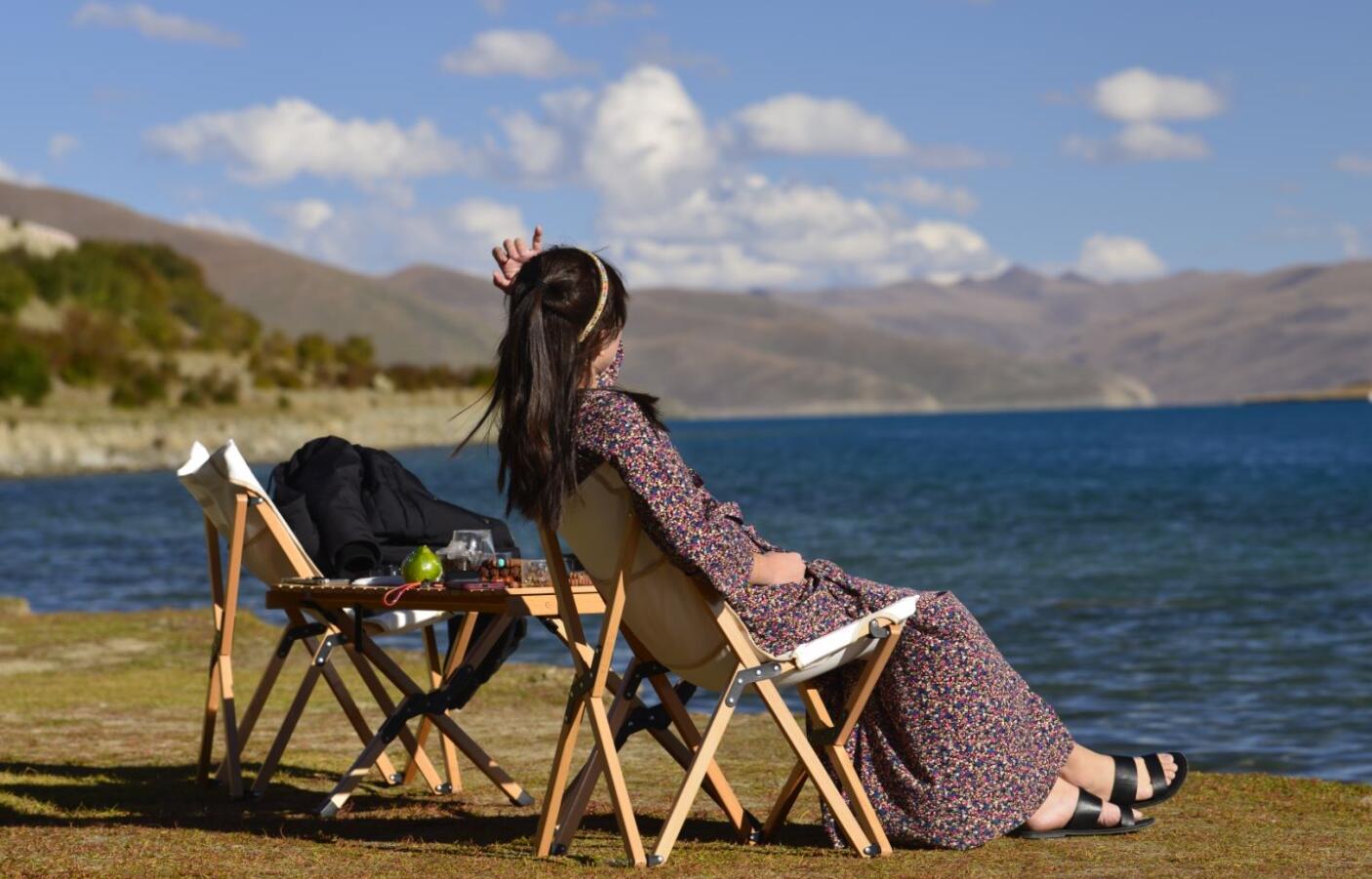在离开羊湖的观景台之后,我们还往前开了一段路,后面顺着这条路走,好像还能走到一个县城,可惜我们并没有去。我们只是找了一个空旷无人的地方,抬上我们的小折叠凳子和桌子,走了一两百米的路到湖边。静静地坐在湖边,享受着日光,感受羊湖的娟秀。当然更多的时间我都用来摄影了,并没有像我想象中的那样好好的去饮一杯茶。高原上的开水煮沸之后并不能达到100度,而且倒出来的开水很快就凉了。